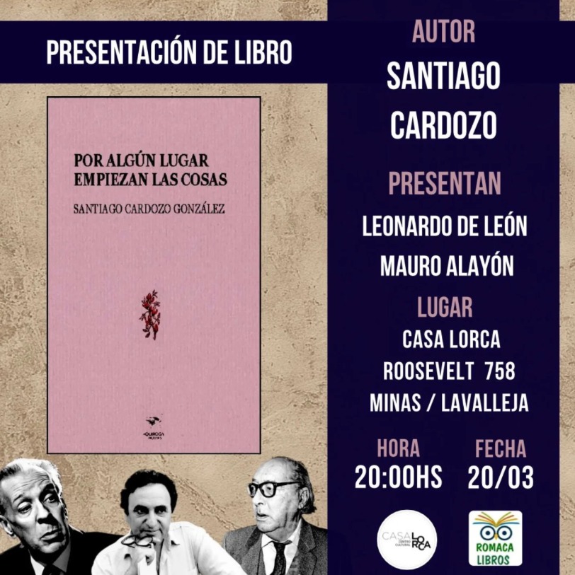 El viernes 20 de marzo llega con una nutrida agenda. En el Centro Cultural “Casa Lorca”, ubicado en Roosevelt 785 casi Sarandí, y con entrada libre, se realizará a las 20:00 horas la presentación del libro “Por algún lugar empiezan las cosas” de Santiago Cardozo. La actividad contará con la participación de Leonardo De León y Mauro Alayón como presentadores. En esta obra, el autor uruguayo explora la literatura desde una perspectiva personal, destacando su interés por los comienzos más que por los finales. El título refleja justamente ese enfoque en los orígenes, los procesos y el inicio de las narrativas.